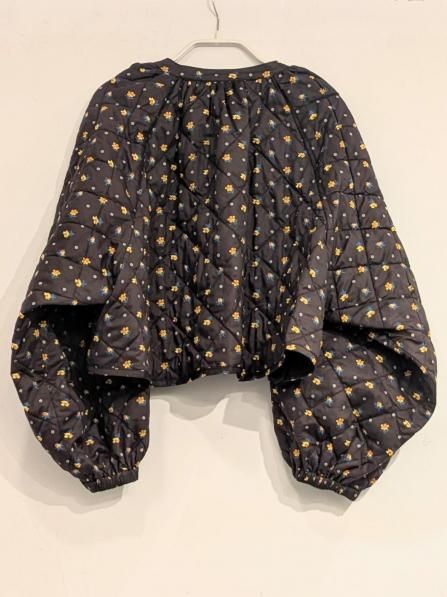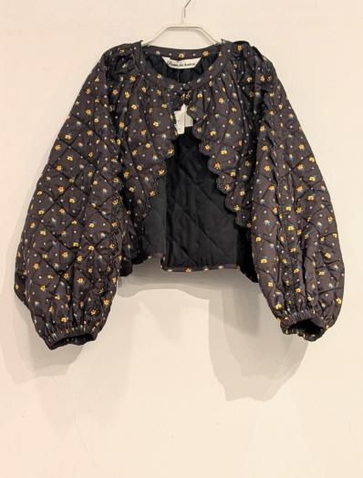 ・着丈43.5cm 袖巾34cm ゆき丈 73cm ・リバティタナローンとポリエステル無地タフタをキルティング加工 ・襟ぐりループ開き(くるみ釦) ・袖口ゴム ・袖山と前端がスカラップ刺繍